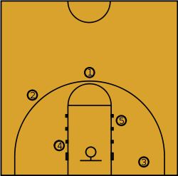 4. Power forward: plays offensively often with their back to the basket; on defense, plays under the basket (in a zone defense) or against the opposing power forward.